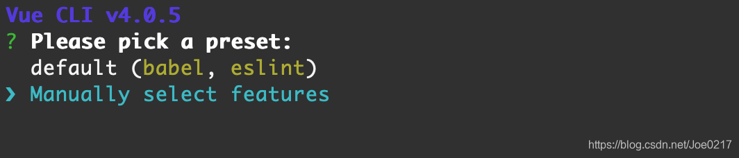在这一步你会被提示选取一个 preset。default包含了基本的 Babel + ESLint ,适合快速创建一个新项目的原型。manually(手动选择特性)则提供了更多的选项,需要手动选取需要的特性,更适合面向生产的项目。