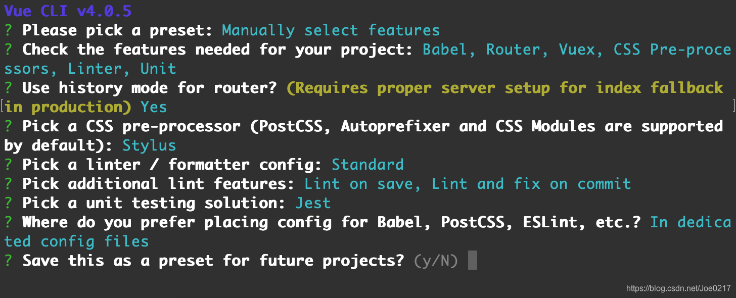 接着就会根据你选择的需要的特性问一堆的问题,这个就要看个人和项目的选择了,最后一句 Save this as a preset for future projects? 是询问你是否保存本次配置。