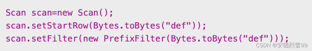 注意,这个Scan虽然能得到预期的效果,但并不高效。Scan会一条条扫描,直到读取到前缀的行为止。所以可以通过设置起始位置来跳过大量打无效数据。Scan会首先定位到这个开始位置,之后从这个位置向后扫描。