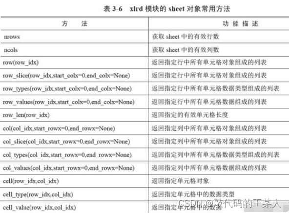 表 3-6 列出了 xlrd 模块的 sheet 对象的常用方法。