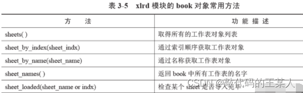 表 3-5 列出了 xlrd 模块的 book 对象的常用方法。