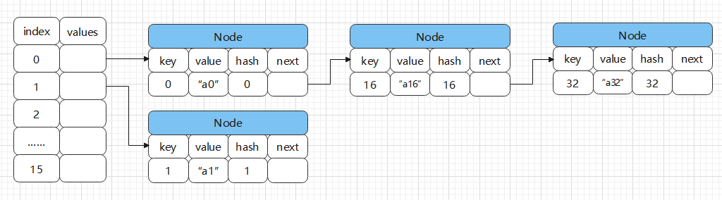 为方便理解上图说的单向链表只有一个元素,下图是 HashMap 的存储结构:(下标1位置的链表就只有一个元素)
