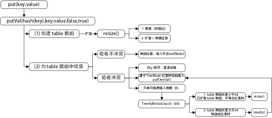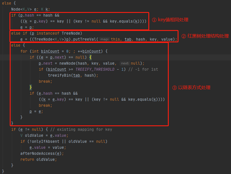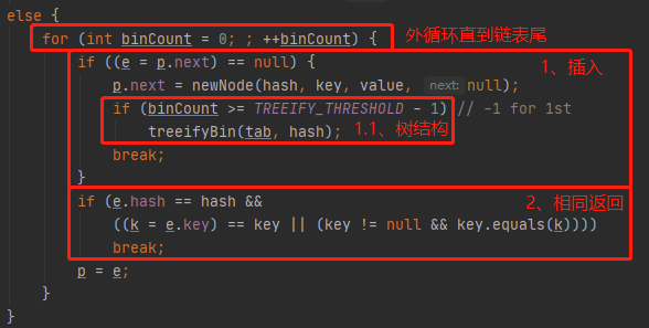 static final int TREEIFY_THRESHOLD = 8;● 外面的 for 循环一直找到能插入数据的链表尾,然后分成两种情况:① 插入;② 比较hash 和 key 值,都相同则直接返回,后面根据 onlyIfAbsent 来选择是否覆盖旧的 value 值。