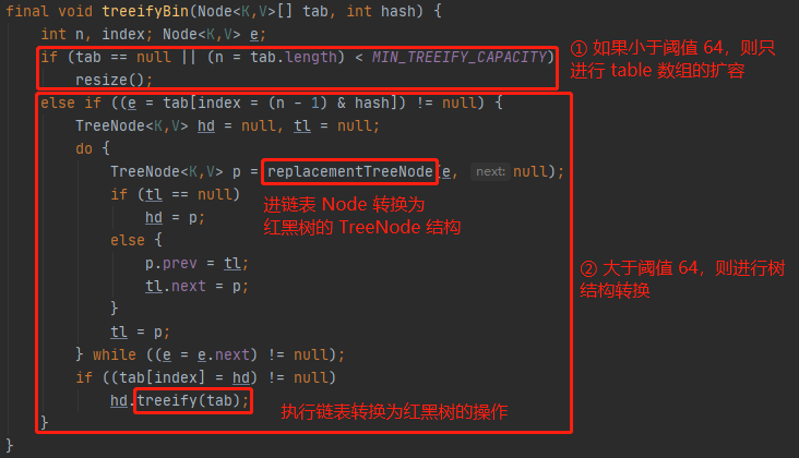 static final int MIN_TREEIFY_CAPACITY = 64;● treeifyBin 可以分为两部分: