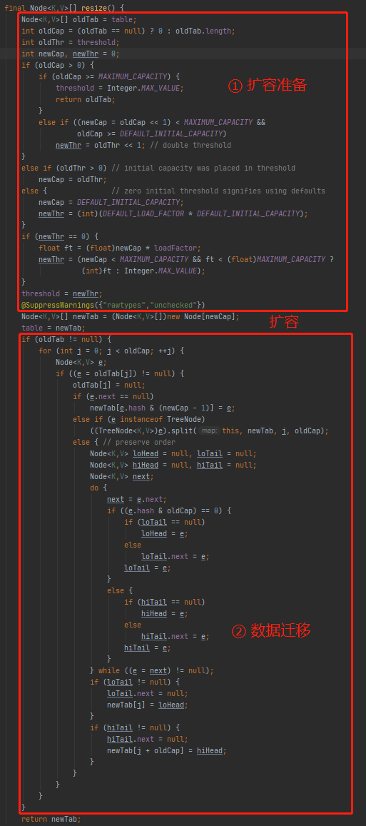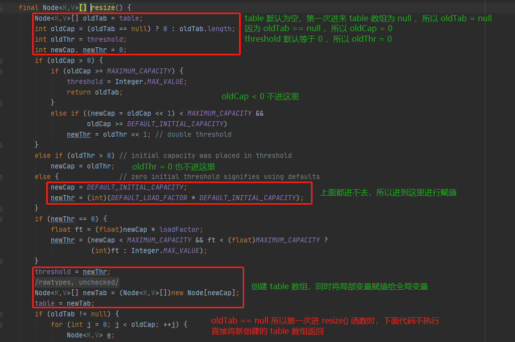 transient Node<K, V>[] table;resize() 函数是进行扩容的函数,但第一次调用则是进行新建。新建一个 table 数组仅用到下面框住的代码。