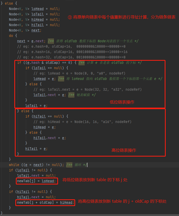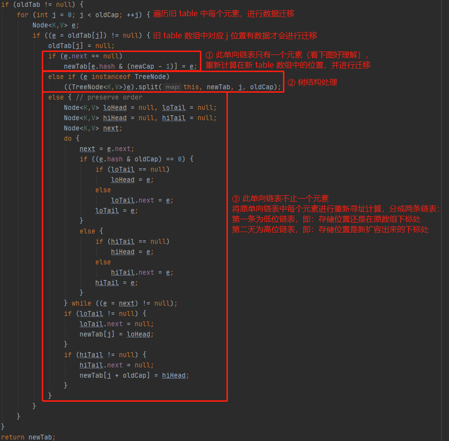 第一部分扩容准备已经在上面 2> 向 table 数组中赋值讲过,下面就分析第二部分数据迁移部分。这一部分又可以分成三种情况:
