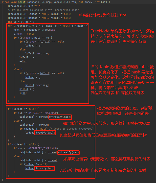 static final int UNTREEIFY_THRESHOLD = 6;红⿊树的拆分⽅式与单向链表的拆分一样⼯,都是将⼀个整体拆分为⾼位和低位两部分。不同的是,拆分后的⾼低位双向链表中,如果数据⼩于等于6个,就不构成红黑树,而是构成链表。构成红黑树的目的是为了在大数据量的情况下能快速查询。但由于每次插⼊或者删除节点,都需要重新调整红⿊树的结构,以满⾜红⿊树的约束,所以,增删操作要慢于链表。所以,当元素很少的情况下,就直接采⽤链表的存储方式。下面分析在此过程中转为链表的 untreeify() 函数;和转为红黑树的 treeify() 函数。