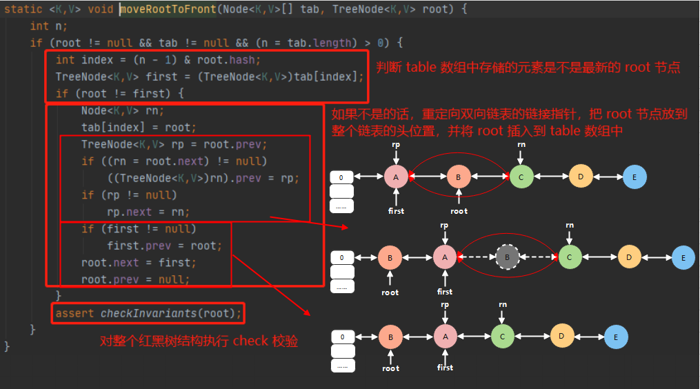红⿊树的平衡操作后,需要执⾏ moveRootToFront ⽅法,将 root 节点放到整条双向链表的头部,并插⼊到table数组中。这是红黑树结构处理插入数据的最后一步。