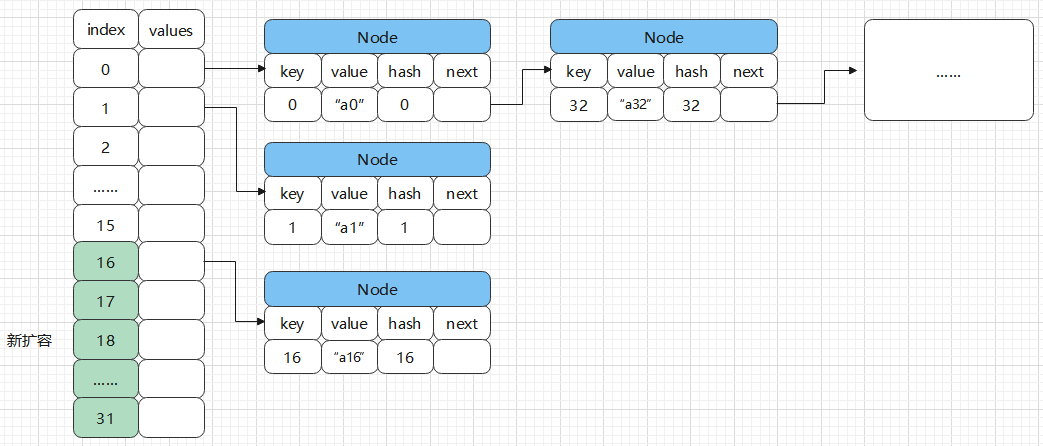 当下标 0 插入第 9 个元素,就会触发扩容的条件,但是由于 table 数组的⻓度小于 64,所以不会转为红⿊树。扩容和数据迁移后,存储结构变成如下所示: