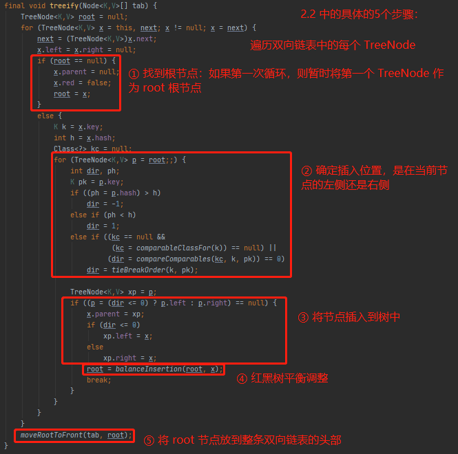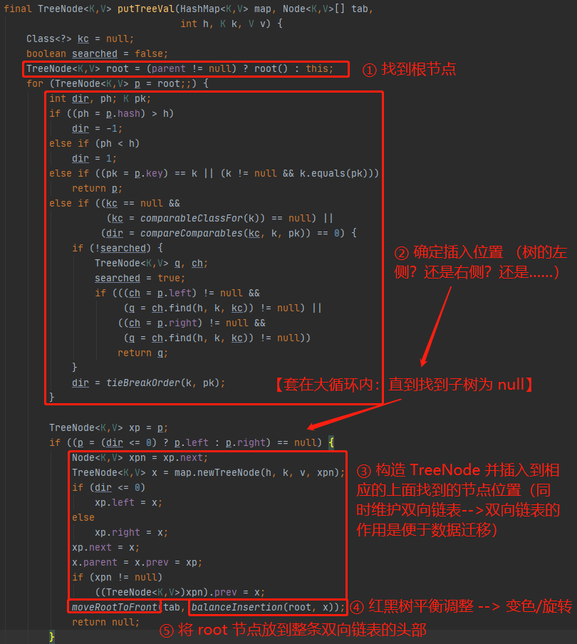 TreeNode<K,V> x = map.newTreeNode(h, k, v, xpn);然后 ① 完成树结构插入数据