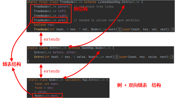注意:这里的双向链表 ,和平常说的 jdk 1.8 后 HashMap 结构为:链表 + 红⿊树 中的链表不是⼀个概念。此双向链表是红黑树上的节点维护的双向链表,作用是便于数据迁移。而 HashMap 结构的链表为单向链表,那个链表是在数据量较小的时候,未形成树结构时的存储结构(下面哈希冲突第三种情况会讲到)。