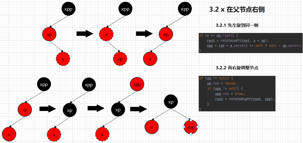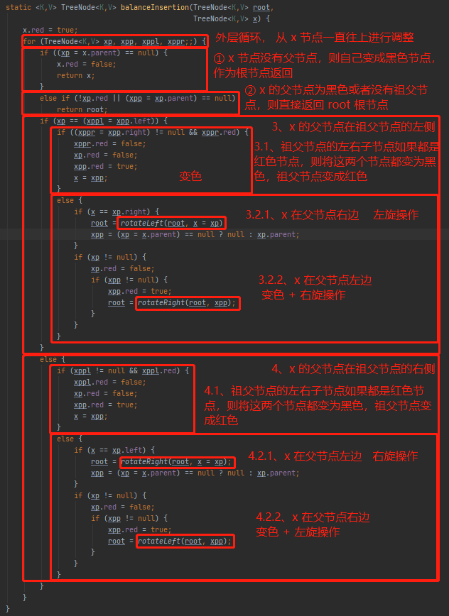 上面完成新节点的插入之后,需要进行红黑树的平衡调整 balanceInsertion(root, x)