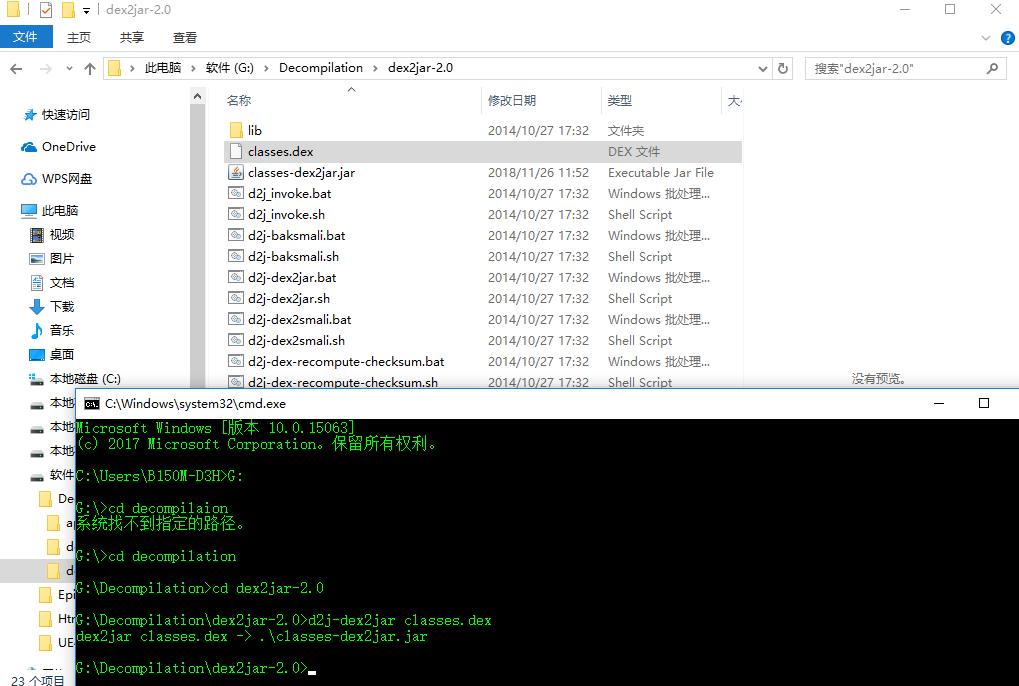 接着把classes.dex文件拷贝到dex2jar解压后的目录下,使用cmd进入dex2jar解压后的目录下,执行如下命令: