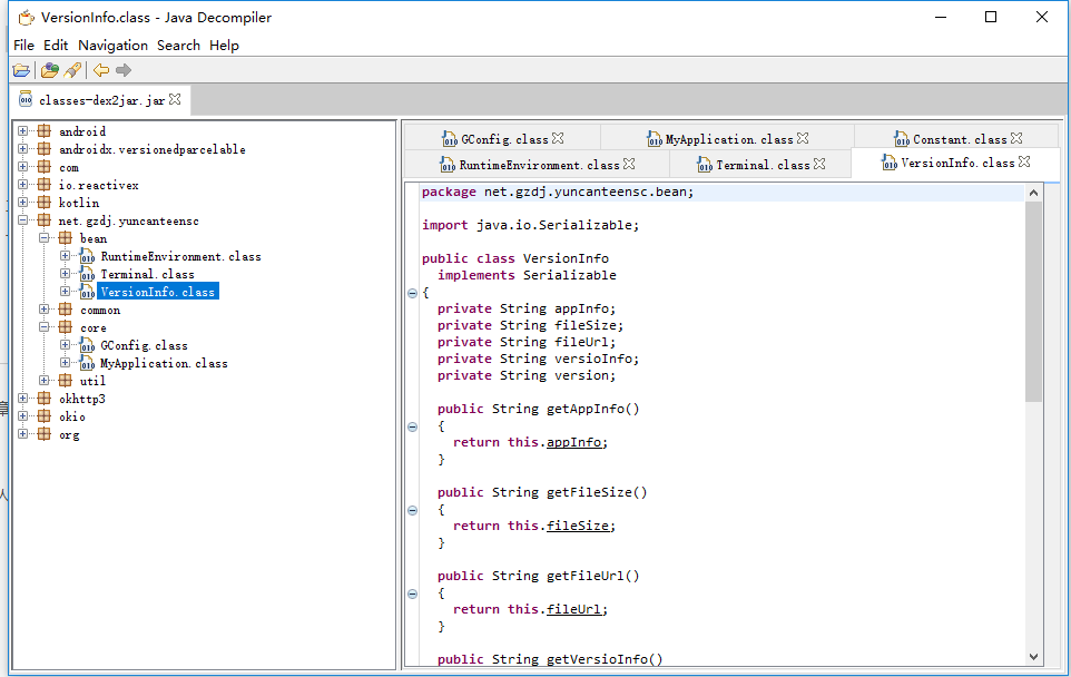 下载地址:http://sourceforge.net/projects/dex2jar/files/ - jd-gui 这个工具用于将jar文件转换成java代码