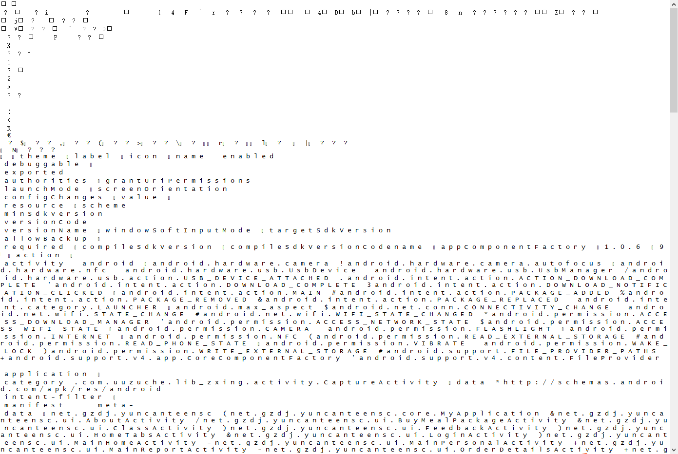 虽然已经反编译完成了但是你无法知道那个是程序的入口啊,此时一般都是去查看androidManifest.xml文件。但是我们反编译并没有这个文件,我们可以回去查看APK解压文件里面是有这个文件的,那直接打开是不是就可以观看到我们想要看的内容呢?答案肯定是不行的,如果这么简单我们还费这么大功夫干嘛是吧?不信?你可以看看:
