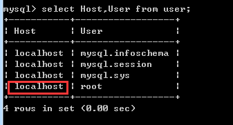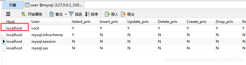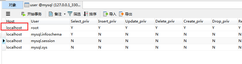 修改mysql库中的user表,将用户root对应的Host值由localhost改为%,并且重启mysql服务生效。