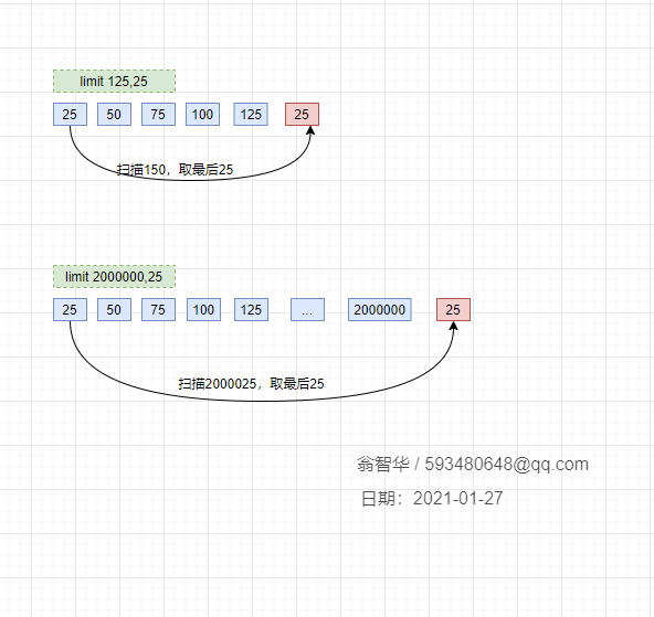 这种查询的慢,其实是因为limit后面的偏移量太大导致的。比如像上面的 limit 2000000,25 ,这个等同于数据库要扫描出 2000025条数据,然后再丢弃前面的 20000000条数据,返回剩下25条数据给用户,这种取法明显不合理。