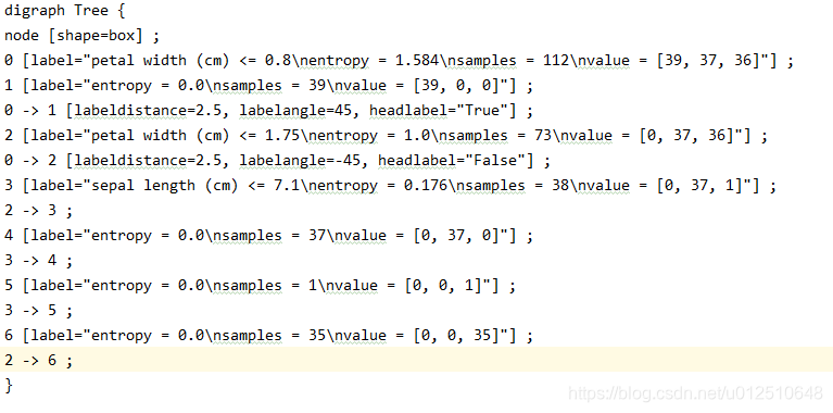 除此之外,结果还有一个可视化文件iris_tree.dot,会在文件列表中,打开之后是这样的形式: