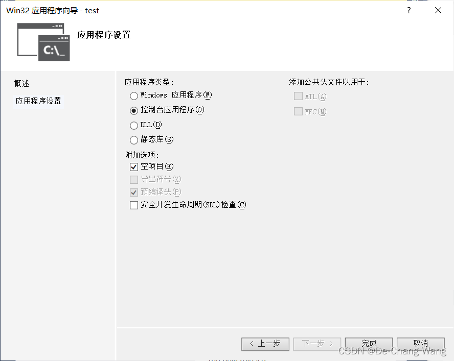 点击“确定”按钮,在弹出的对话框的左侧选择“应用程序设置”,右侧选择“空项目”,并取消“安全开发生命周期(SDL)检查”的选择,详细如下图所示: