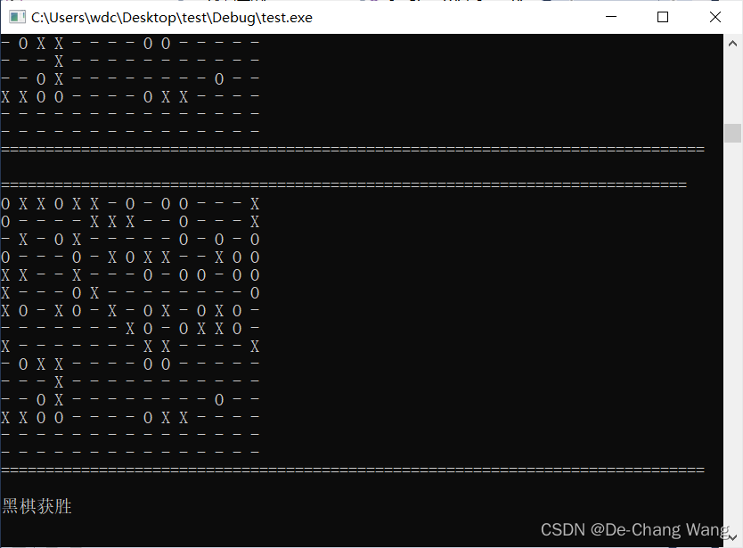 运行项目,在控制台界面中不断按键盘来显示下一次落子位置,直至结束: