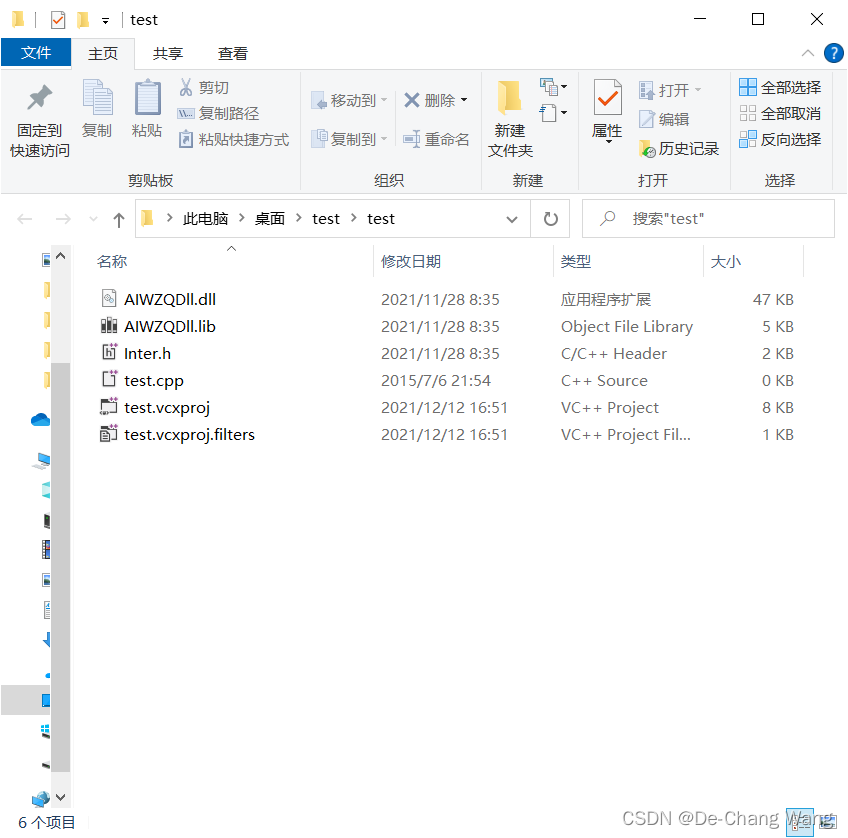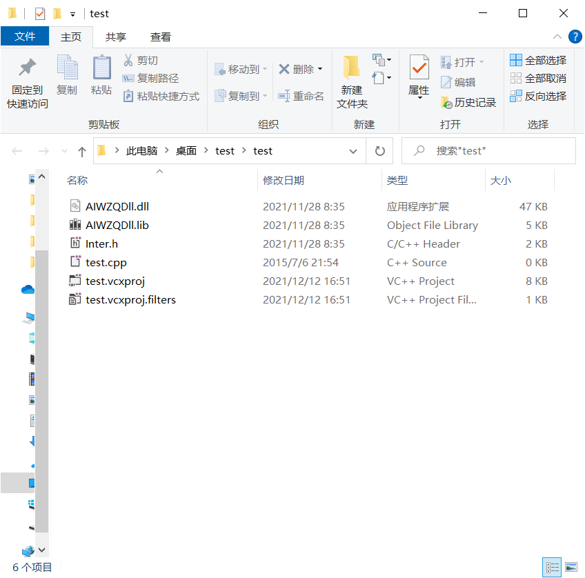 打开test.cpp所在的目录,将SDK文件(AIWZQDll.dll、AIWZQDll.lib、Inter.h)拷贝到该目录,如下图: