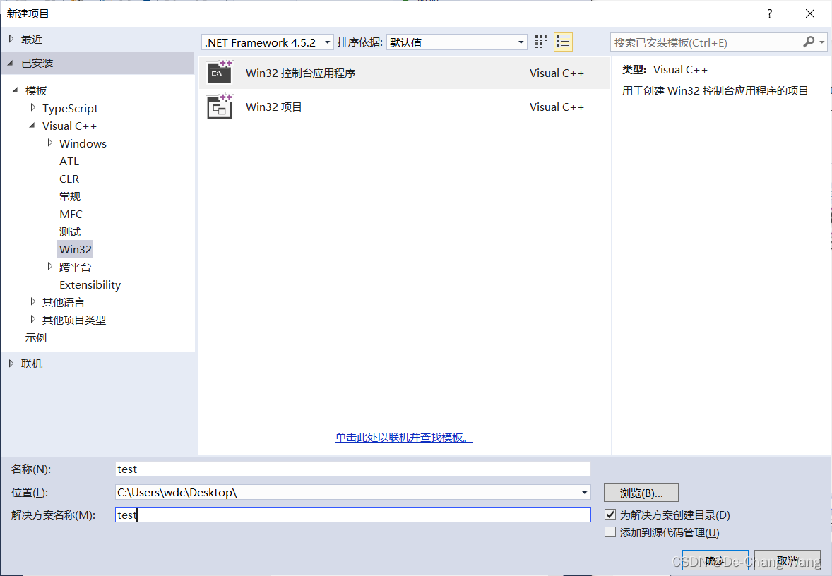 运行Visual Studio 2015(其它版本的VS也可以使用),选择菜单“文件-->新建-->项目”,在对话框的左侧选择“已安装-->模板-->Visual C++-->Win32”,在右侧选择“Win32控制台应用程序”,并选定项目保存的位置和项目名称(此处项目名为test,保存在桌面),如下图所示: