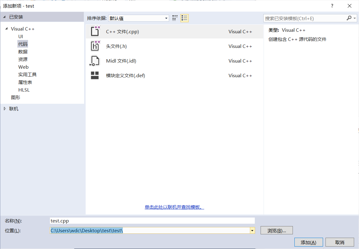 在解决方案资源管理器中右击test项目,在右键菜单中选择“添加-->新建项”,在弹出的对话框左侧选择“已安装-->Visual C++-->代码”,在右侧选择“C++文件”,在下方输入源代码文件的名称(本例为test.cpp),如下图所示: