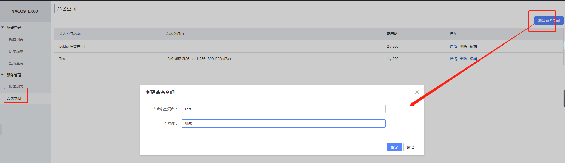1、nacos创建Test命名空间,创建完成后,列表中多了一条Test记录