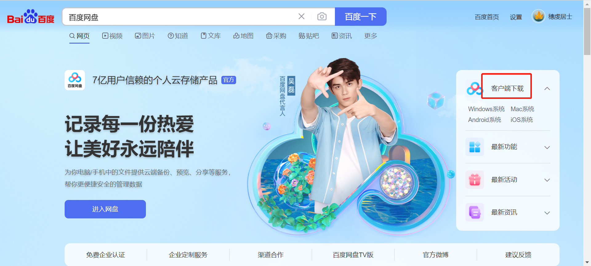 1、百度搜索“百度网盘”,点击“客户端下载”