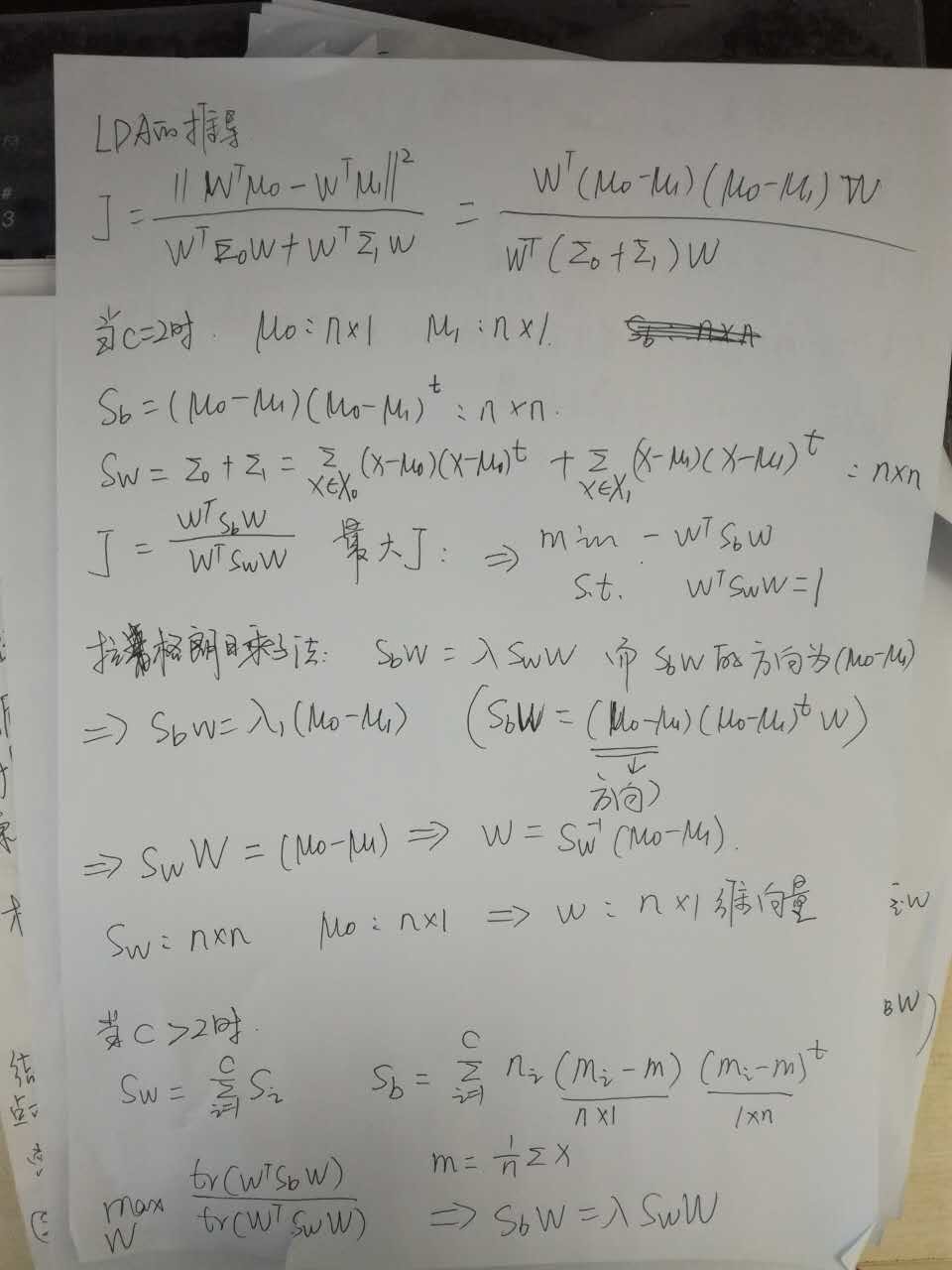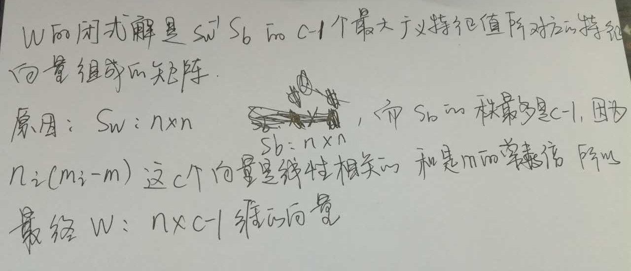 对于n维特征、C个类别、m个样本的数据,是将n维数据映射为C-1维。即所求的w是一个n*(c-1)的矩阵。S_w是一个n*n的矩阵(没有除以样本数的协方差矩阵之和),S_B是一个C*C的矩阵,实际上S_B矩阵的的秩最多是C-1,这是因为n_i*(m_i-m)这c向量实际上是线性相关的,因为他们的和是均值m的常数倍。这导致后面求解w,实际上是求出C-1个向量一个构成的一个w。