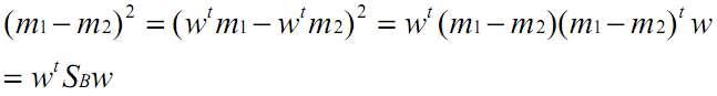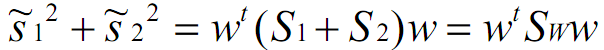 PS:这里不用纠结与Sw的协方差矩阵形式,实际上这是拆拆开来w和w_t后的结果,实际上w*Sw*w_t后,仍旧是一个数值,即表示两个类的投影后方差之和。