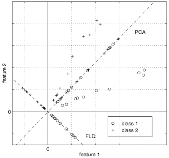 两个类别,class1的点都是圆圈,class2的点都是十字。图中有两条直线,斜率在1左右的这条直线是PCA选择的映射直线,斜率在 -1左右的这条直线是LDA选择的映射直线。其余不在这两条直线上的点是原始数据点。可以看到由于LDA考虑了“类别”这个信息(即标注),映射后,可以很好的将class1和class2的点区分开。也就是说,LDA是以分类为导向的,考虑的是如何选择投影方向使得分类更好,是有监督的;而PCA是一种无监督的降维方式,它只是单纯的降维,它考虑的是如何选择投影面才能使得降维以后的样本信息保留的最大(而这是通过方差大来体现的)。