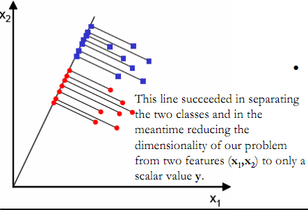 可以看到两个类别,一个绿色类别,一个红色类别。左图是两个类别的原始数据,现在要求将数据从二维降维到一维。直接投影到x1轴或者x2轴,不同类别之间会有重复,导致分类效果下降。右图映射到的直线就是用LDA方法计算得到的,可以看到,红色类别和绿色类别在映射之后之间的距离是最大的,而且每个类别内部点的离散程度是最小的(或者说聚集程度是最大的)。