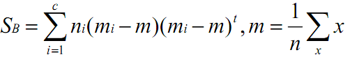 对于S_b,以前是“两个类别的均值之差的绝对值”,现在多个类别了,怎么计算呢?计算任意两个类别之间的均值之差的绝对值之和?这样对于N个类别,需要 C(N,2)次计算,这可能是一个方法,不过LDA使用的方法,计算每个类别的均值与所有类别均值的差异,并且对每个类别的数据量进行加权处理。下式中,m为所有类别的均值,m_i为类别i的均值,n_i为类别i的数据量。