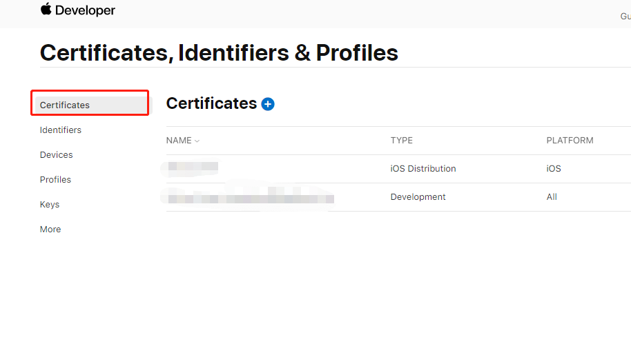 3、去苹果开发者中心,登录进后台,点击Certificates菜单,点击蓝色+号,开始创建cer证书。