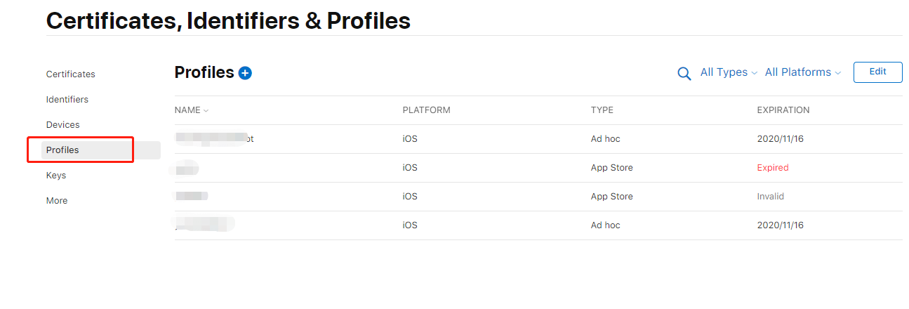 2、点击profiles,点击蓝色加号创建描述文件。过程中选择app store类型。