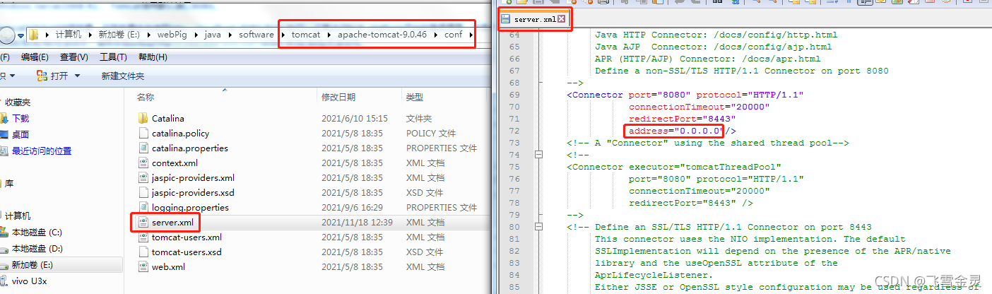 找到tomcat的安装目录下的conf目录,E:\webPig\java\software\tomcat\apache-tomcat-9.0.46\conf\server.xml在设置端口地方,增加address="0.0.0.0",修改后结果如下: