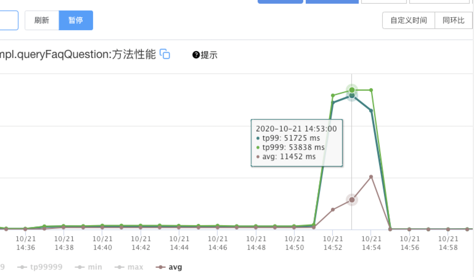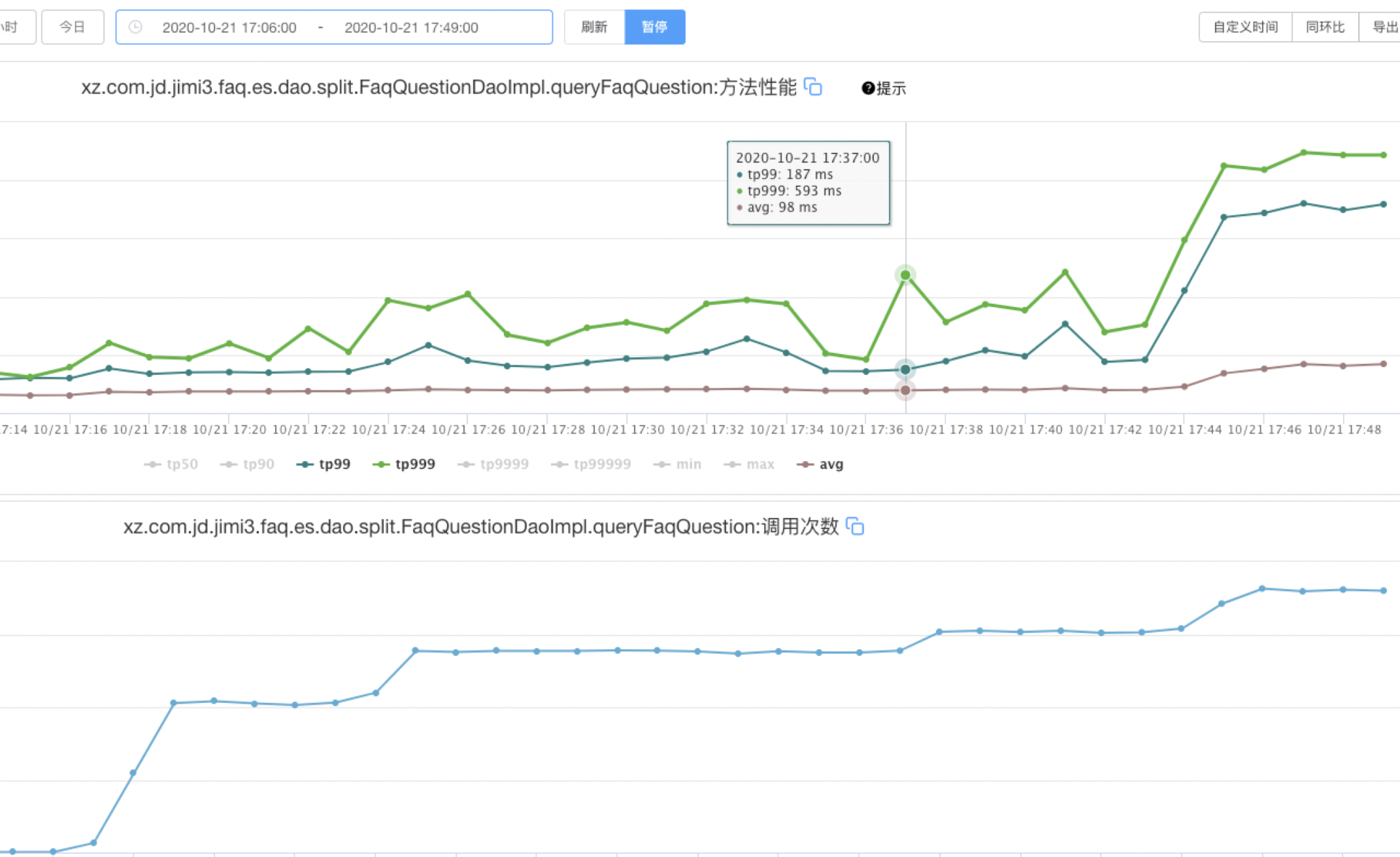 京东客服备战双十一时,有一个index的数据量 2.2G ,集群的信息是 8个 dataNode,开始的时候创建索引时,shard=8,replica=1(历史),当进行压测的时候,TPS=2500的时候,当tps=2500时 TP99=50S, TP999=53S, AVG=10S,具体见下图: