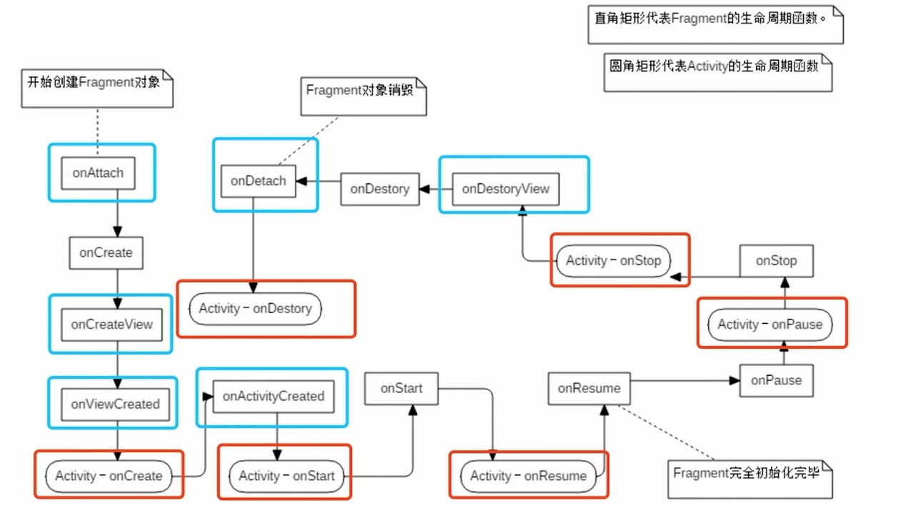 - onAttach()。当碎片和活动建立关联的时候调用。