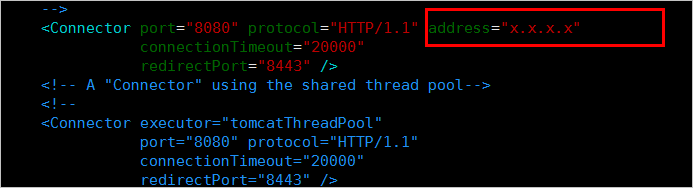 Connector中添加address的信息:<Connector port="8080"protocol="HTTP/1.1"address="实例公网IP地址"