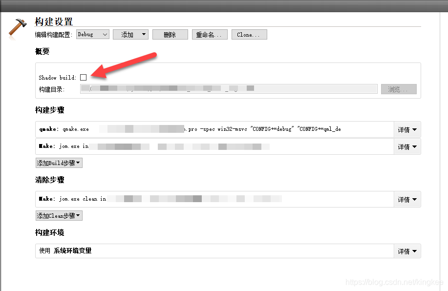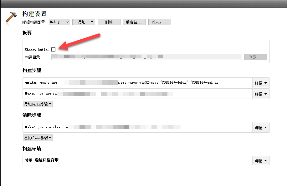 把 【Shadow build】 的方框打上勾,问题就解决了。
