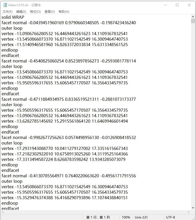 上面这个是ASCII编码格式的stl,上图可以看到,这种编码的stl文件,可以直接用记事本打开,facet normal后面的三个数字代表法向量的三个分量,紧挨着的三个vertex行,后面的三个浮点数代表面片三个顶点的坐标。