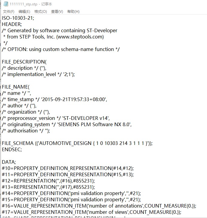 stp文件的格式本质上也是一个ASCII格式的文件,比如现在随意用记事本打开一个stp文件: