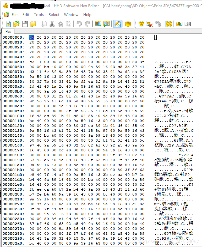 上图中这个stl文件是二进制的格式,所以用记事本打开肯定是一篇乱码。这个时候,就要用hexEditor打开:
