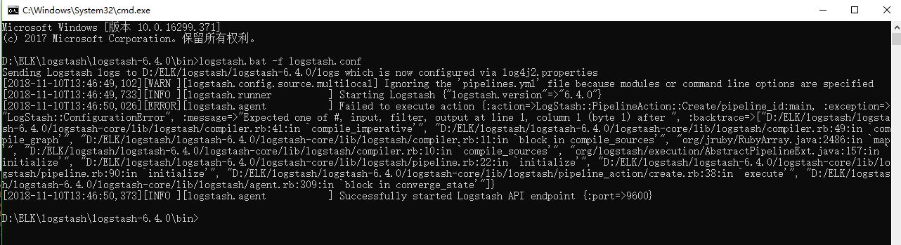 D:\ELK\logstash\logstash-6.4.0\bin>logstash -f ..\config\logstash.conf