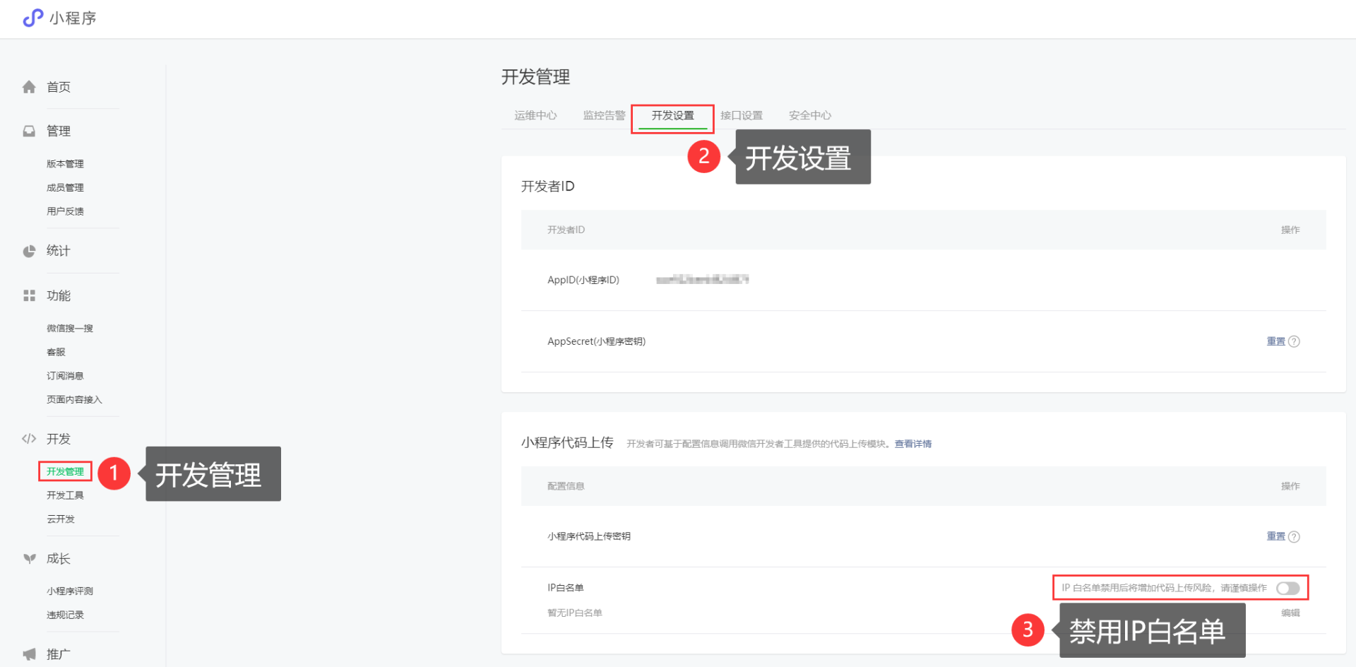 A:请检查 CI 白名单是否已关闭,登录 小程序后台,在开发 > 开发管理 > 开发设置中,IP 白名单必须是禁用状态。