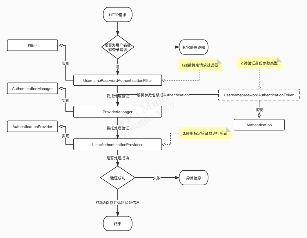 可以理解为Filter中并没有承担核心的身份信息校验责任,主要完成校验请求是否为用户名密码请求,如果是提取出相关参数,委托给AuthenticationManager组件校验身份,如果成功返回Authentication对象。这里有几个关键的类: