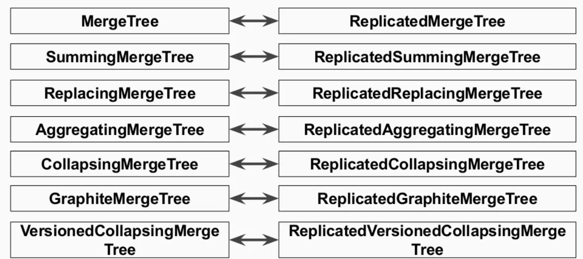 目前支持复制表的引擎是ReplicatedMergeTree引擎族,它与平时最常用的MergeTree引擎族是正交的,如下图所示。