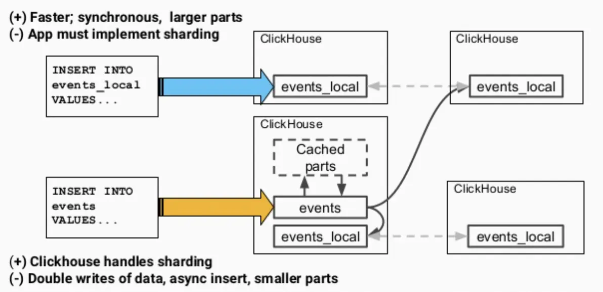 相对而言,直接写本地表是同步操作,更快,parts的大小也比较合适,但是就要求应用层额外实现sharding和路由逻辑,如轮询或者随机等。