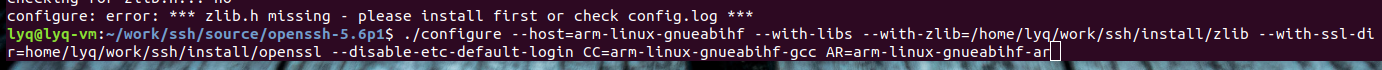 ./configure --host=arm-linux --with-libs --with-zlib=/home/zuopeng/work/ssh/install/zlib --with-ssl-dir=/home/zuopeng/work/ssh/install/openssl --disable-etc-default-login CC=arm-linux-gcc AR=arm-linux-ar